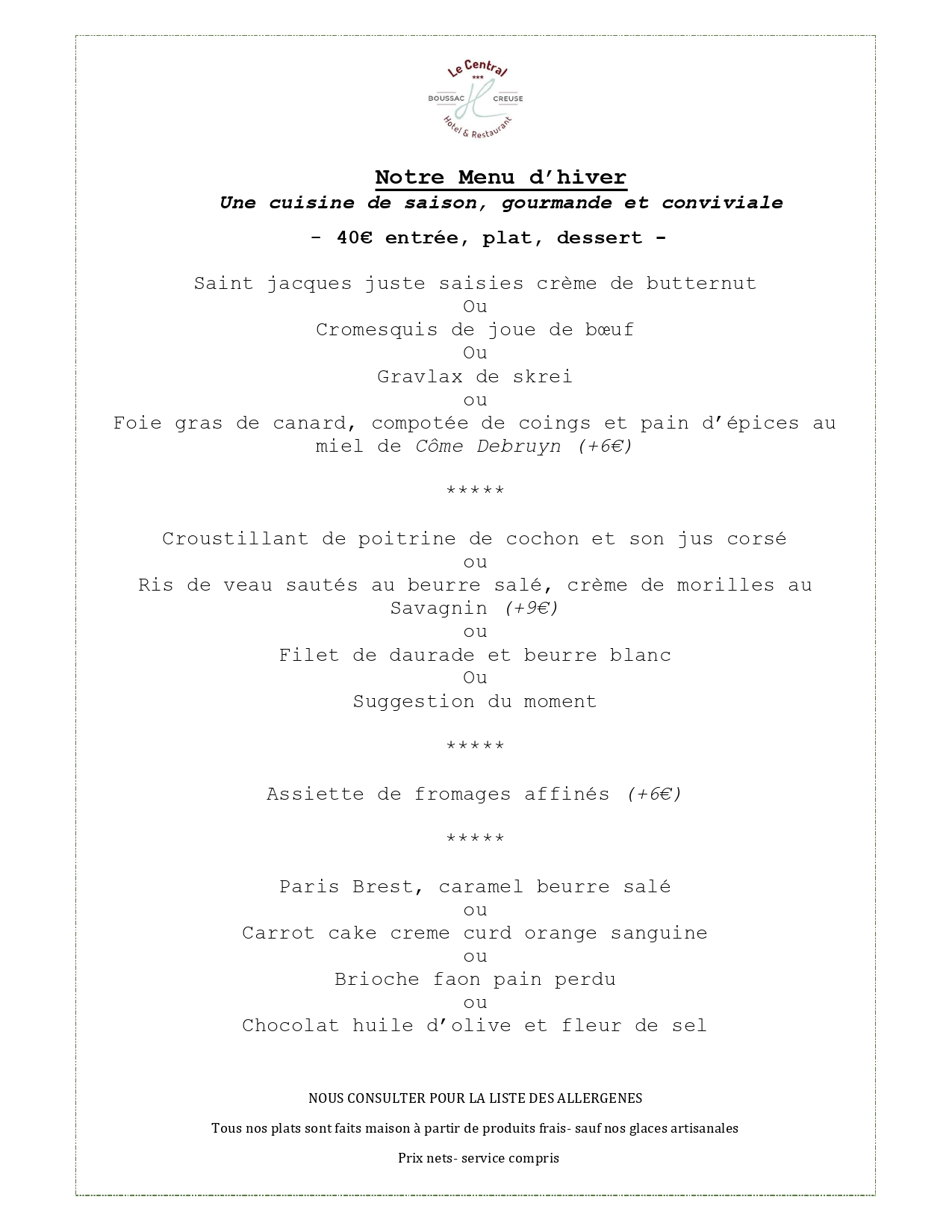 A la fois traditionnelle et inventive, la cuisine de Jérôme MENU incite à la gourmandise. Notre Chef vous propose une carte en accord avec les saisons. Entre spécialités de nos régions et ses créations, il vous invite à déguster sa cuisine gourmande et raffinée. Travaillant exclusivement des produits frais et des environs principalement, notre carte évolue à chaque saison.