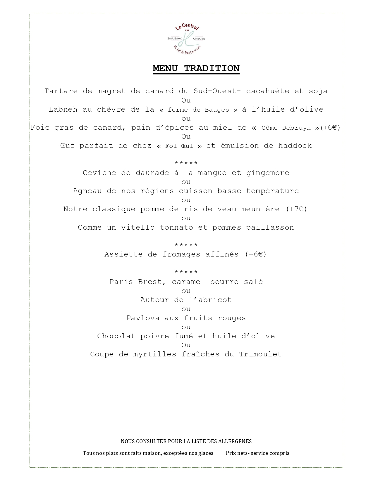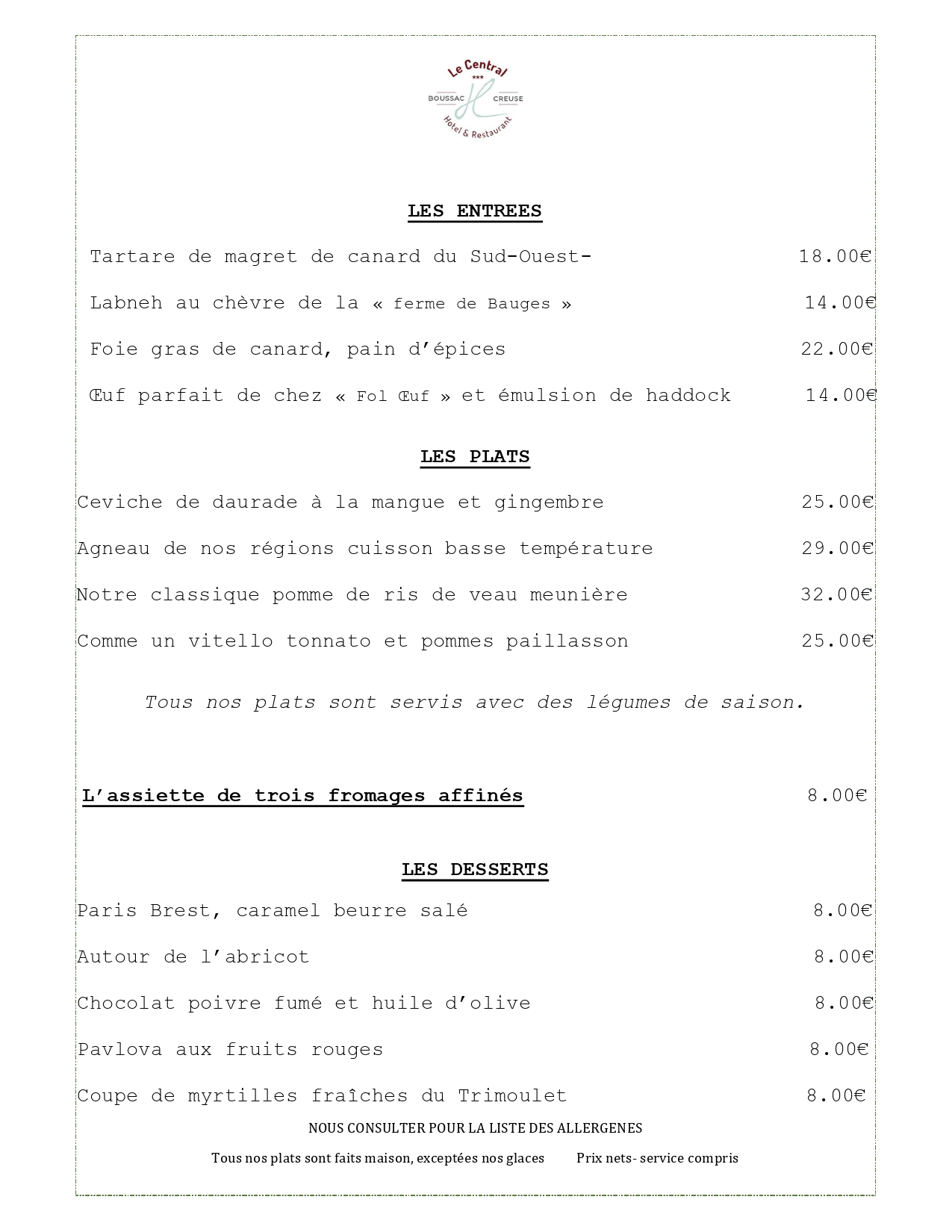 A la fois traditionnelle et inventive, la cuisine de Jérôme MENU incite à la gourmandise. Notre Chef vous propose une carte en accord avec les saisons. Entre spécialités de nos régions et ses créations, il vous invite à déguster sa cuisine gourmande et raffinée. Travaillant exclusivement des produits frais et des environs principalement, notre carte évolue à chaque saison.